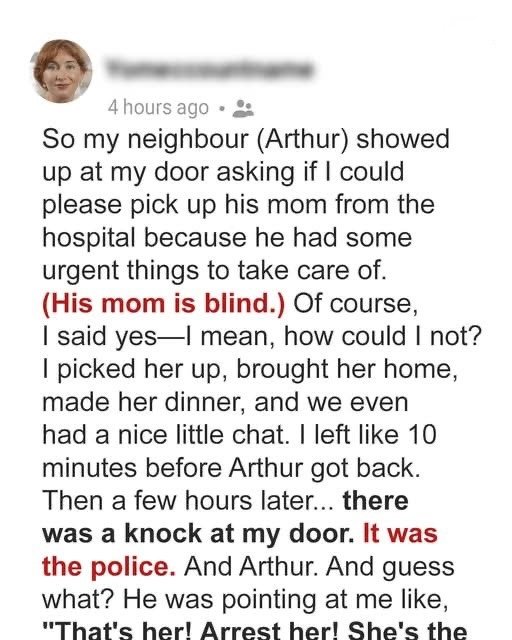 My Neighbor Asked Me to Pick Up His Blind Mother from the Hospital — That Same Evening, He Showed Up with the Police
