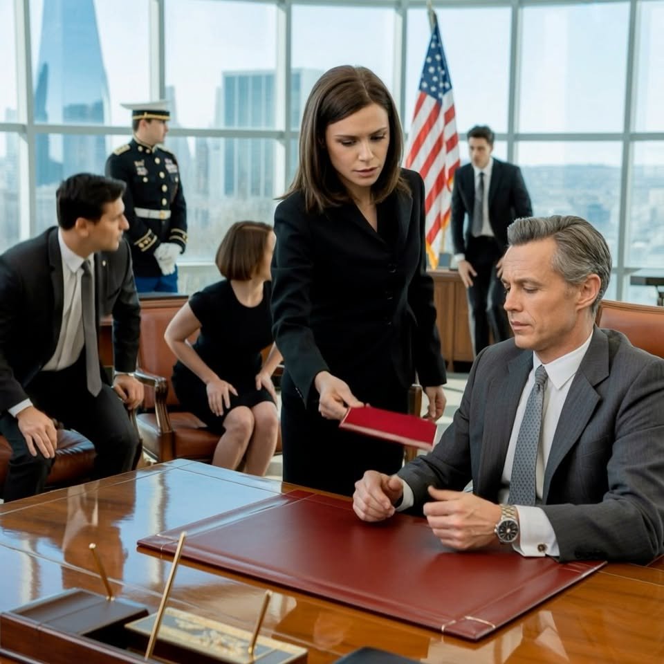 Miles Calder looked down. He saw the red cardstock. He saw the tape. He saw the logo. The color drained from his face so fast it was like someone had pulled a plug in his heels. He went gray. His mouth opened, but no sound came out. His hand, which had been holding a gold fountain pen, went limp. Clack. The pen hit the table and rolled, coming to a stop against the edge of the blue document.