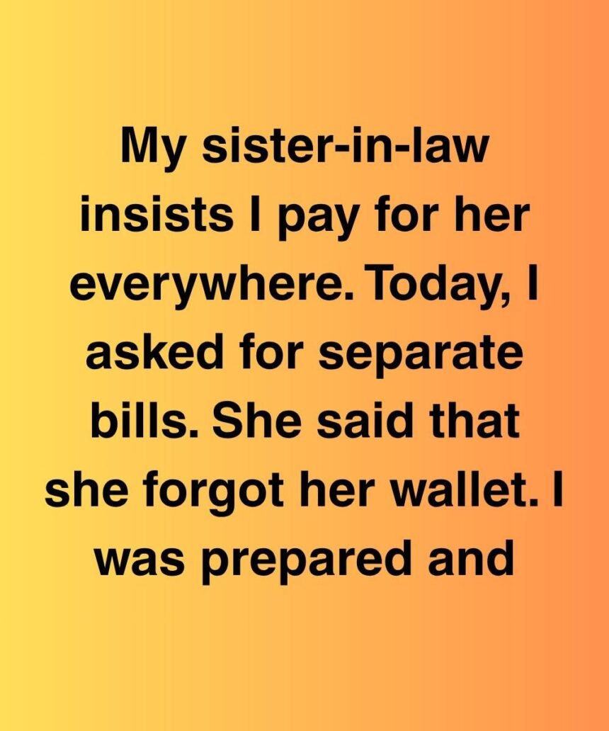 Sis-in-law demands I pay for her everywhere. Today, I requested separate bills. Left her wallet, she claimed.