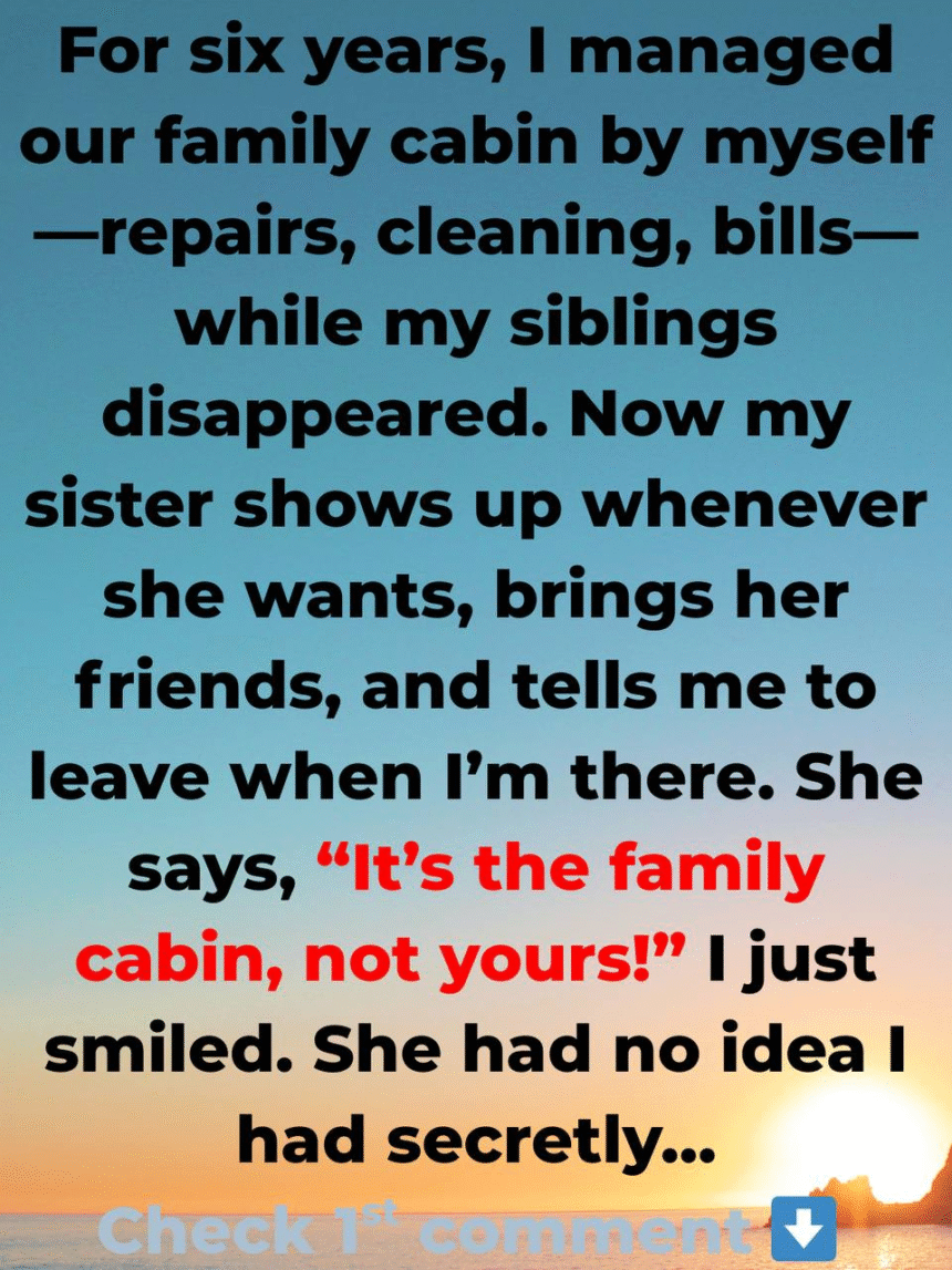 A little while ago, I confronted her about her behavior, and she said, “It’s our family’s cabin, not YOURS!” I was shocked by her greed, but I just smiled and left. What she didn’t know was that I secretly bought my parents and brother out.