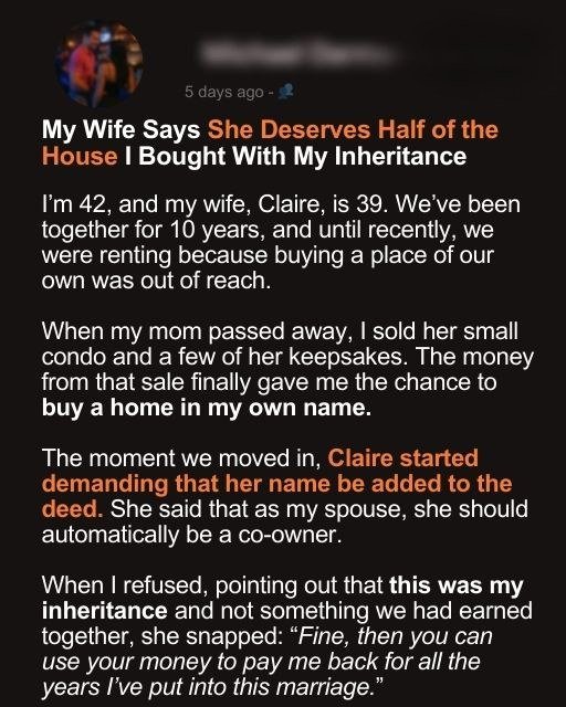 That inheritance finally gave me the chance to buy a home outright, in my name. But the moment we moved in, Claire insisted that her name be added to the deed. She said that as my spouse, she was entitled to co-ownership.