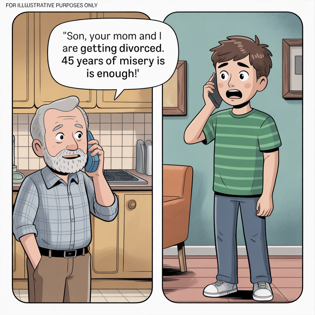 “Listen up, kid!” he says. “Your mother and I have decided to end our marriage.” Forty-five years of this suffering is more than sufficient.