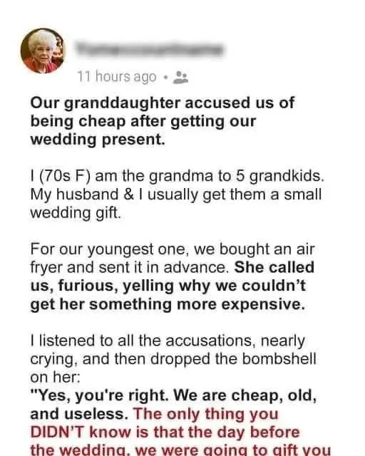 This time, we sent an air fryer to our youngest granddaughter, the cheapest thing on her registry. Eloise called us, livid, accusing us of being cheap. I remember picking up her call and she didn’t even say hi, she just started ranting, “Seriously, Grandma?