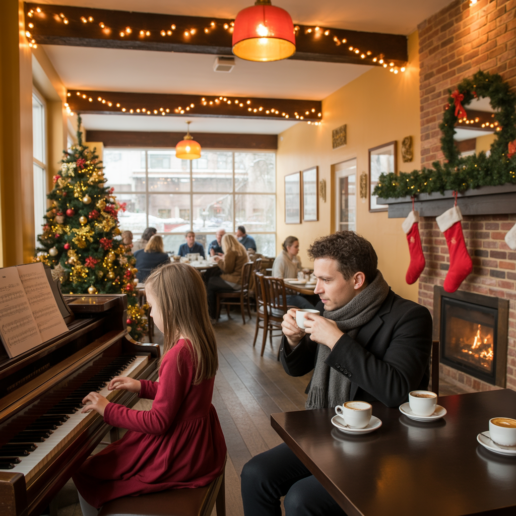 He ordered a coffee and sat near the back, folding his hands together, staring through the fogged window into the snowy dark. That was when he heard it. The first few notes were soft. A piano slightly out of tune, played with care. Hesitant fingers, small and uncertain, pressed down on the keys. He turned. Near the Christmas tree sat a little girl, about five, curly brown hair tied back with a red ribbon. Her red dress fluttered slightly as her feet dangled above the floor. She played with quiet focus, making up in heart what she lacked in precision.