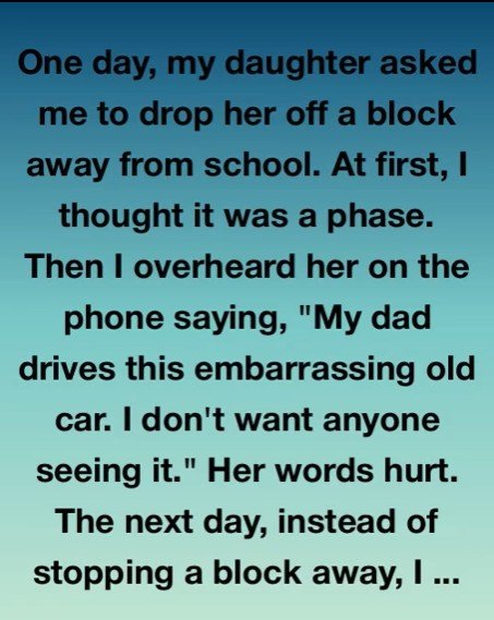 One day, my daughter asked me to drop her off a block away from school. At first, I thought it was a phase. Then I overheard her on the phone saying, “My dad drives this embarrassing old car. I don’t want anyone seeing it.” Her words hurt. The next day, instead of stopping a block away, I pulled right up to the front entrance of her school.