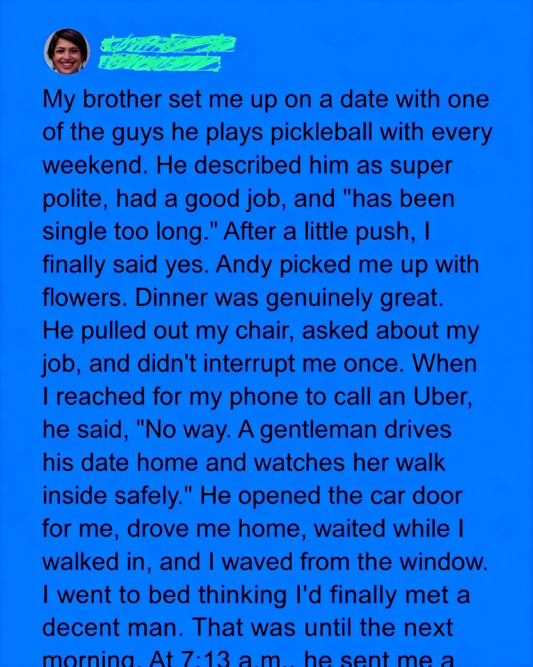 At 7:13 a.m., Andy sent me a cheerful message thanking me for the evening and asking if I’d like to go hiking that weekend. I smiled—his enthusiasm was refreshing—but before I could respond, a second message followed, this one much longer.