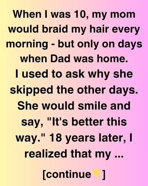 Only when Dad was home did my mom braid my hair every morning when I was 10. I wondered why she skipped other days. She smiled and said, “It’s better this way.”
