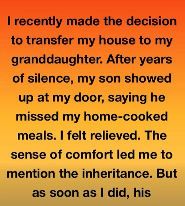 I recently made the decision to transfer my house to my granddaughter. After years of silence, my son showed up at my door, saying he missed my home-cooked meals. I felt relieved. The sense of comfort led me to mention the inheritance. But as soon as I did, his expression shocked me.