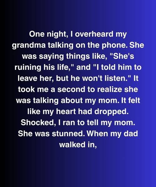 One night, I overheard my grandma talking on the phone. She was saying things like, “She’s ruining his life,” and “I told him to leave her, but he won’t listen.” It took me a second to realize she was talking about my mom. It felt like my heart had dropped. Shocked, I ran to tell my mom. She was stunned. When my dad walked in, she turned toward him with this trembling look in her eyes and said, “Do you know what your mother’s been saying about me?”