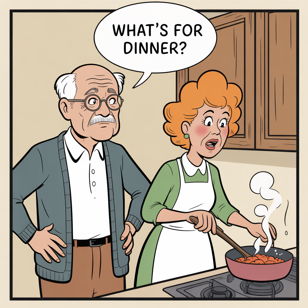 George sighs, “She turned around and yelled, ‘For the FOURTH time, GEORGE—it’s CHICKEN!’”