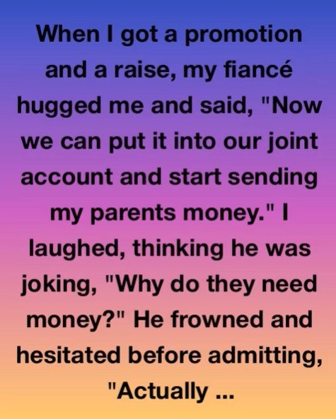 When I got a promotion and a raise, my fiancé hugged me and said, “Now we can put it into our joint account and start sending my parents money.” I laughed, thinking he was joking, “Why do they need money?” He frowned and hesitated before admitting, “Actually… they’ve been struggling for a while. I’ve been sending them part of my salary every month. I hoped you’d help once we had more.”