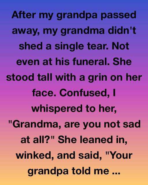 After my grandpa passed away, my grandma didn’t shed a single tear. Not even at his funeral. She stood tall with a grin on her face. Confused, I whispered to her, ‘Grandma, are you not sad at all?’ She leaned in, winked, and said, ‘Your grandpa told me not to cry. He said when he goes, I should wear the smile he fell in love with. So that’s what I’m doing.’