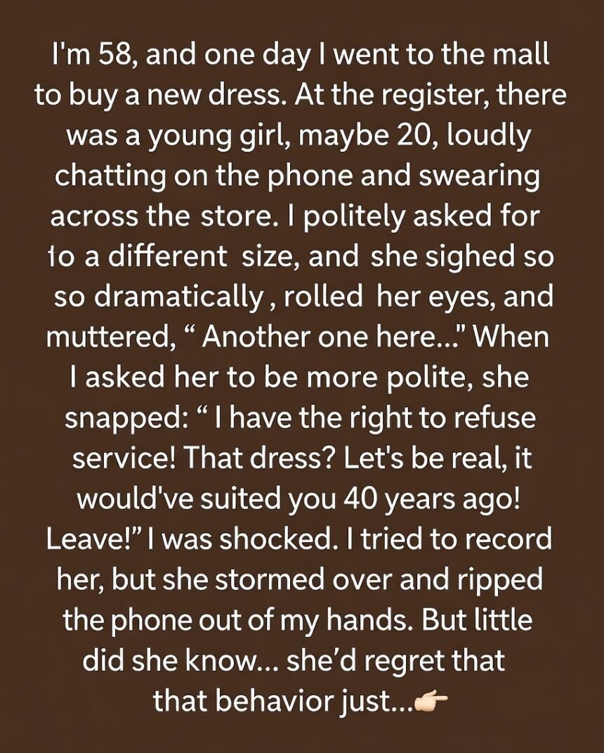Then she sneered that the dress “would’ve suited me forty years ago” and, when I tried to take out my phone, she yanked it right out of my hand. Before I could respond, a woman around my age walked out from the back the store owner, and the girl’s mother.