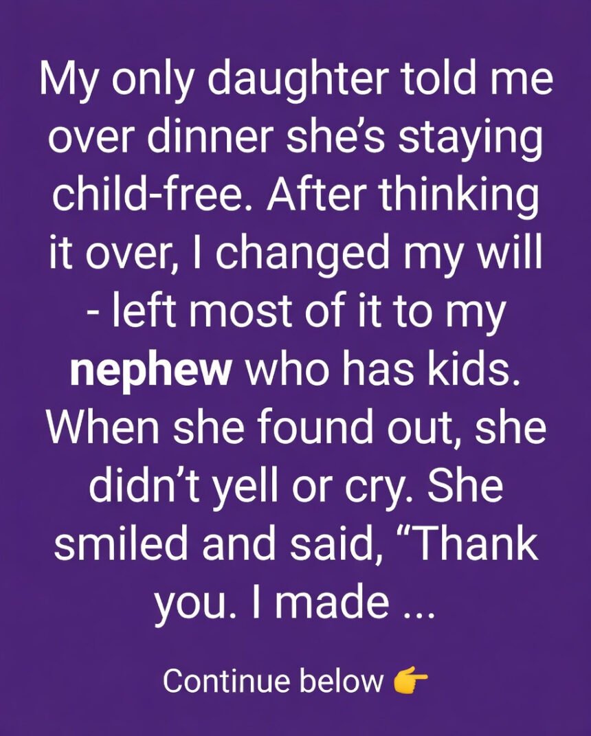 My only daughter told me over dinner she’s staying child-free. After thinking it over, I changed my will—left most of it to my nephew who has kids. When she found out, she didn’t yell or cry.