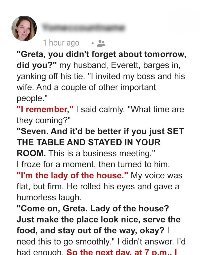 When Greta is told to serve dinner and disappear during her husband’s big work meeting, something inside her shifts. After twelve years of silence, she’s ready to reclaim her voice—one carefully timed sentence at a time.The night before, Rett walked in, yanking off his tie like it had insulted him. “Greta, you didn’t forget about tomorrow, did you?