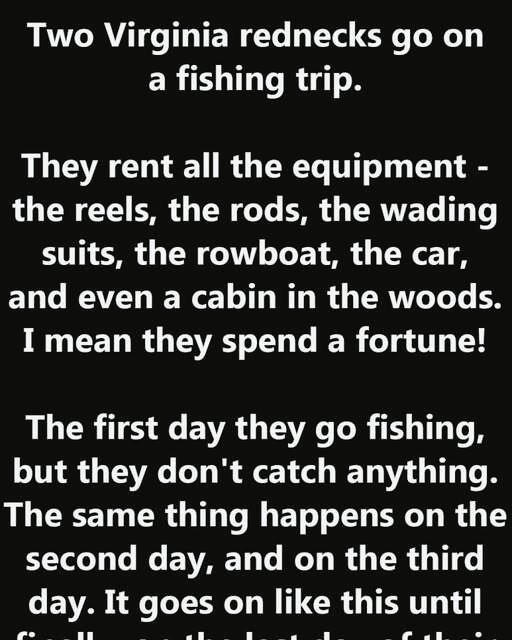 Two Virginia rednecks go on a fishing trip. They rent all the equipment – the reels, the rods, the wading suits, the rowboat, the car, and even a cabin in the woods. I mean they spend a fortune!