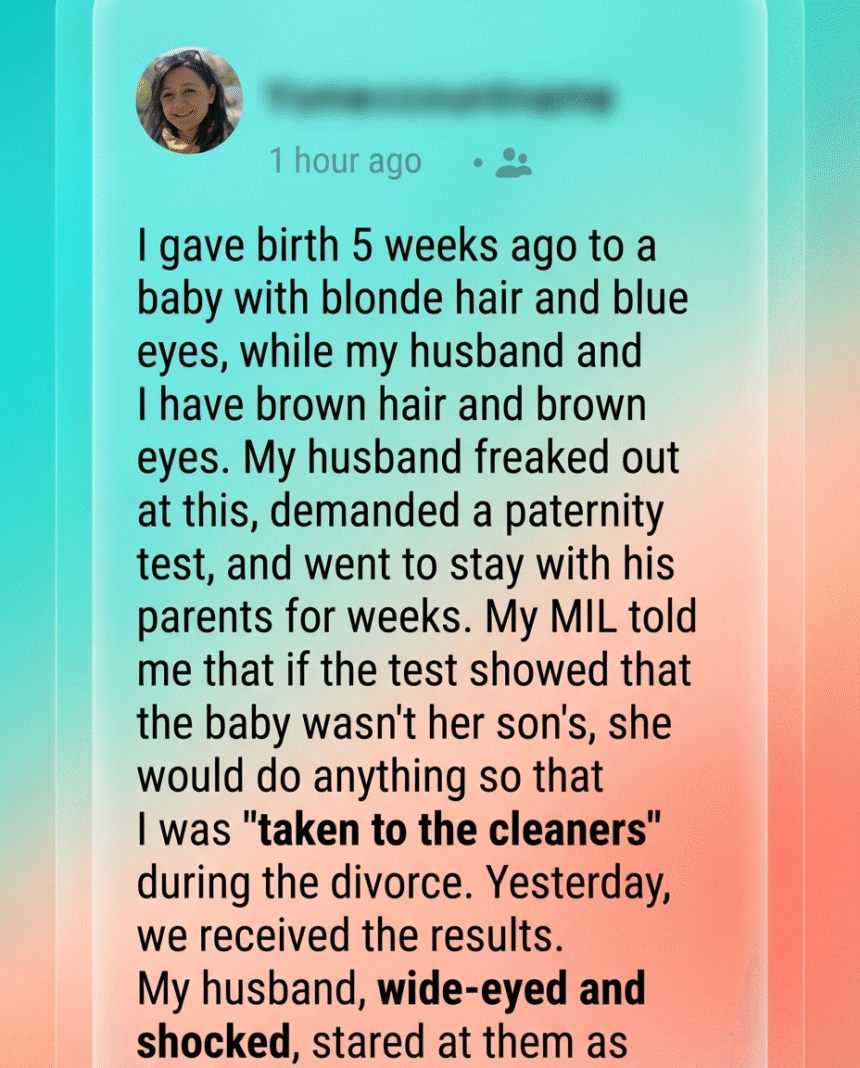 For weeks, I was left alone with a newborn, while my mother-in-law coldly warned me that if the test proved the baby wasn’t his, she’d “make sure I paid for it.”