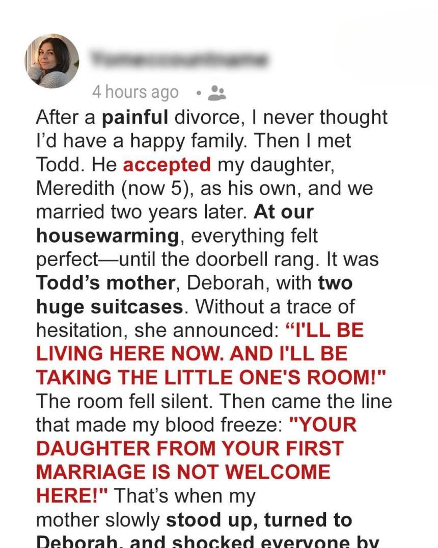 It was Todd’s mother, Deborah, standing there with two massive suitcases. Without asking, she swept inside and declared she’d be moving in… and taking Meredith’s bedroom. Then she looked straight at me and said the words that made my blood run cold: “Your daughter from your first marriage isn’t welcome here.”